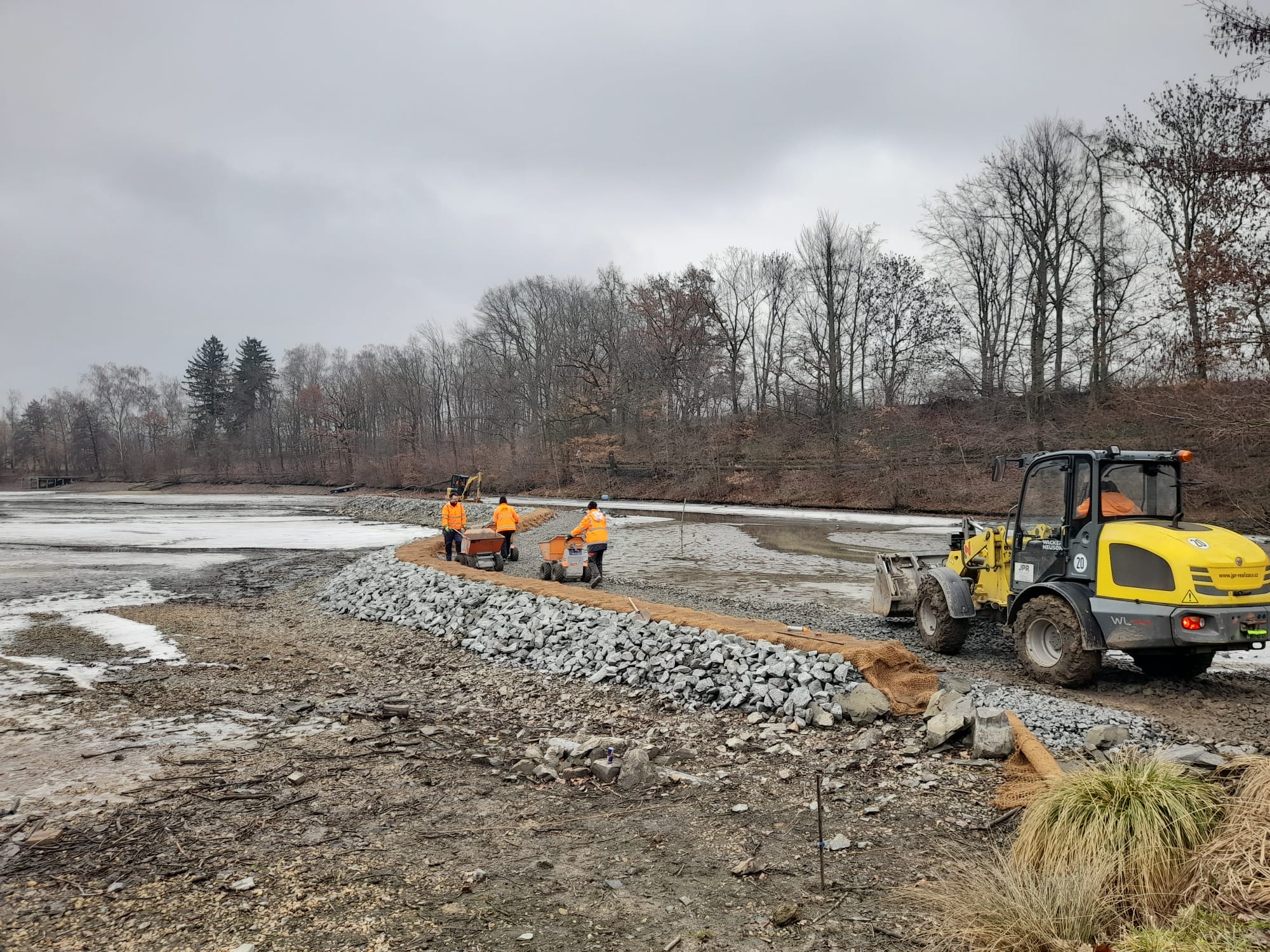 Zahájili jsme práce na dělící hrázi litorálního pásma rybníka Marvánek.