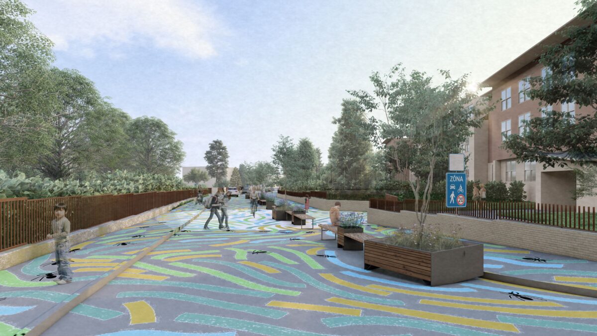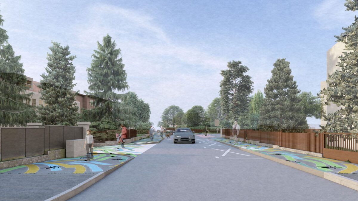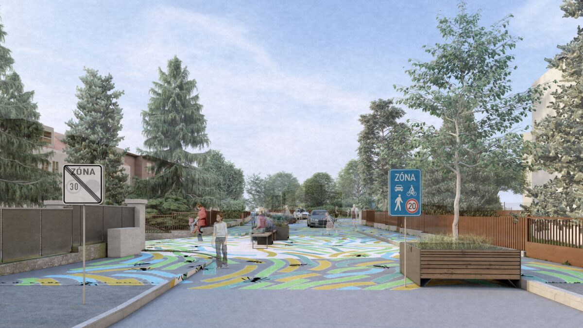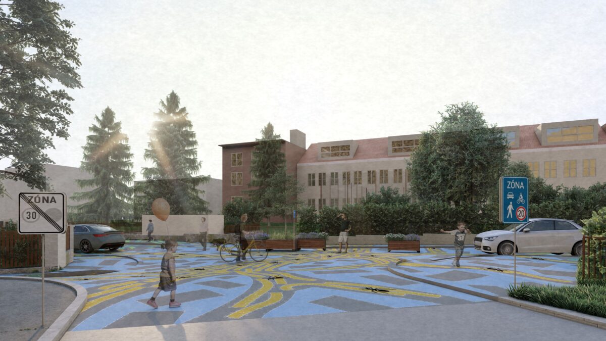 Návrh sdílené zóny. Výtvarné zpracování: Jakub Vosecký Zpracovatel vizualizací: Vojtěch Novotný – mobility consultancy & advisory s.r.o., Ing. arch. Adéla Hajná.