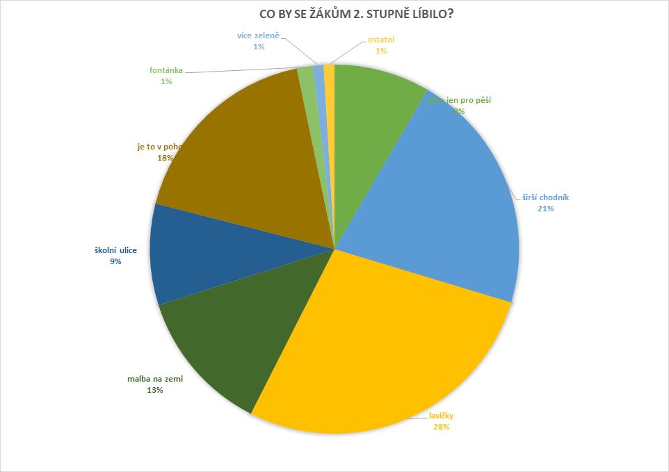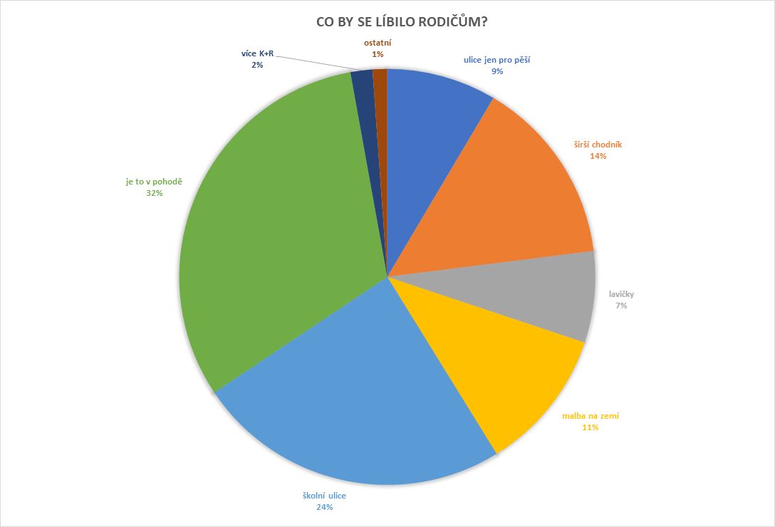 Na otázku, jak by se mohl změnit prostor před školou, většina žáků i rodičů uváděla, že by si přála bezpečnější, přívětivější a klidnější prostředí. Žáci 2. stupně by nejvíce ocenili lavičky a širší chodník, tedy více prostoru pro společnou chůzi a trávení času. Rodiče by z navržených opatření nejvíce uvítali školní ulici. Podrobné představení výsledků dotazníku bude zveřejněno na webu školy.