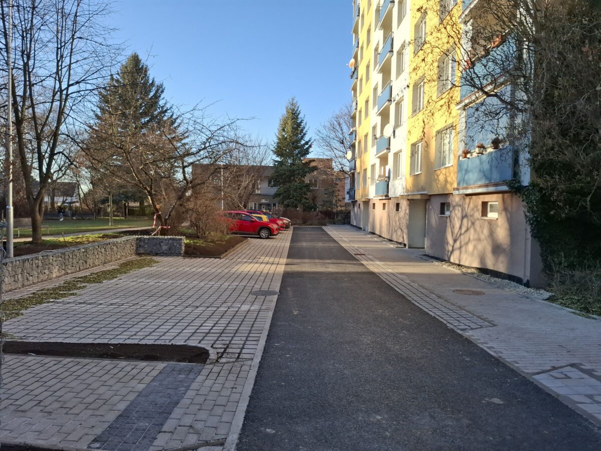 V rámci úprav bylo vybudováno nové stanoviště na tříděný odpad, které je nově umístěno za gabionovou zídkou. Proběhla kompletní výměna vozovky a vznikla parkovací stání s povrchem ze vsakovací dlažby. Z parkoviště vede nová zámková cesta ke kotelně a přechodu do Olivovy ulice, upraveno bylo také nároží. Vyměněny byly lampy veřejného osvětlení a připraveny plochy pro zatravnění. Přes zimu budou doplněny lavičky, odpadkové koše a ohebné sloupky pro průjezd IZS.