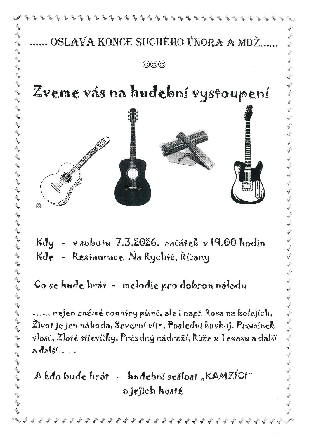 Zveme vás na hudební vystoupení – melodie pro dobrou náladu. Nejen známé country písně, ale i např. Rosa na kolejích, Život je jen náhoda, Severní vítr, Poslední kovboj, Pramínek vlasů..