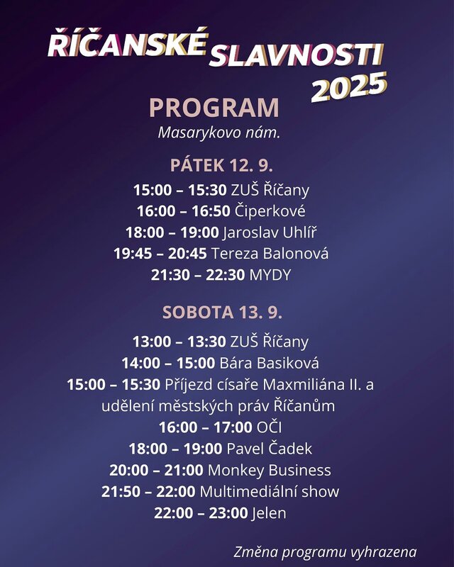 Těšit se můžete na bohatý program, který oživí centrum Říčan i přilehlé lokality. Čekají vás koncerty, hudební vystoupení, kreativní dílničky, workshopy, výborné jídlo a pití a spoustu dalšího. Doprovodný program bude připraven pro všechny generace – od nejmenších po seniory.